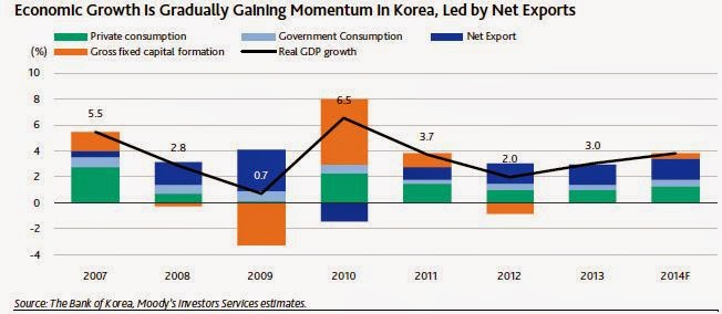 무디스는 한국의 경제성장이 점진적으로 가속화되고 있다고 판단하며, 2014년 한국의 실질 GDP 성장률을 3%-4%로 전망했다. 이러한 예상치는 2012년과 2013년의 2% 3% 성장률 대비 높은 수준이지만 2008-09년 글로벌 금융위기 이전의 4%-5% 대비 낮은 수준이다.