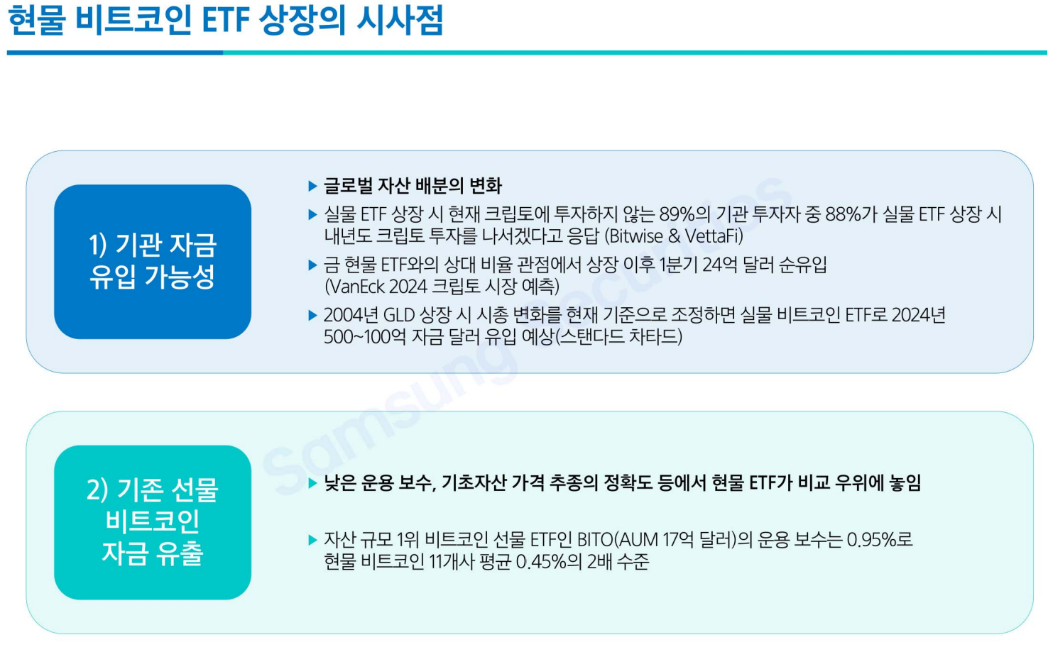 그동안 비트코인의 높은 변동성과 비제도권 거래 특성에 대해 부정적인 인식을 보였던 SEC가 결국 가상자산 시장으로 제도권 자금이 투입될 수 있는 통로를 마련해준 것이다. 비트코인 실물 ETF의 등장은 가상자산 시장에 대한 접근성과 편의성을 개선할 수 있는 계기가 될 것으로 인식된다. 기존 선물 ETF보다 운용 보수 등의 장점을 보유하고 있다.